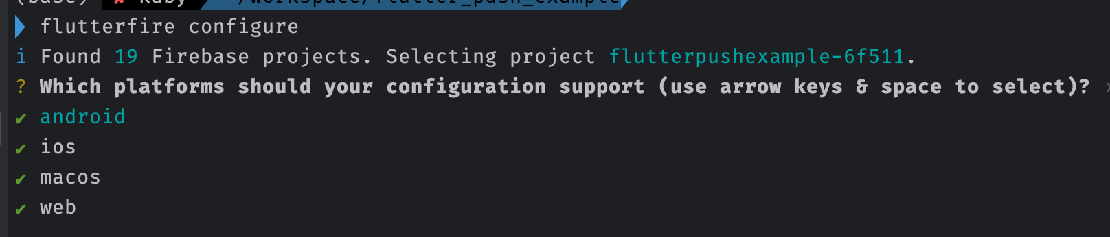 5. Project Root 에 .firebaserc 파일을 생성합니다.{ "projects": { "default": "<1 항목에서 기억 해 둔 프로젝트 ID>" } }6. Flutter 프로젝트 Root 에서 아래 명령어를 실행합니다.