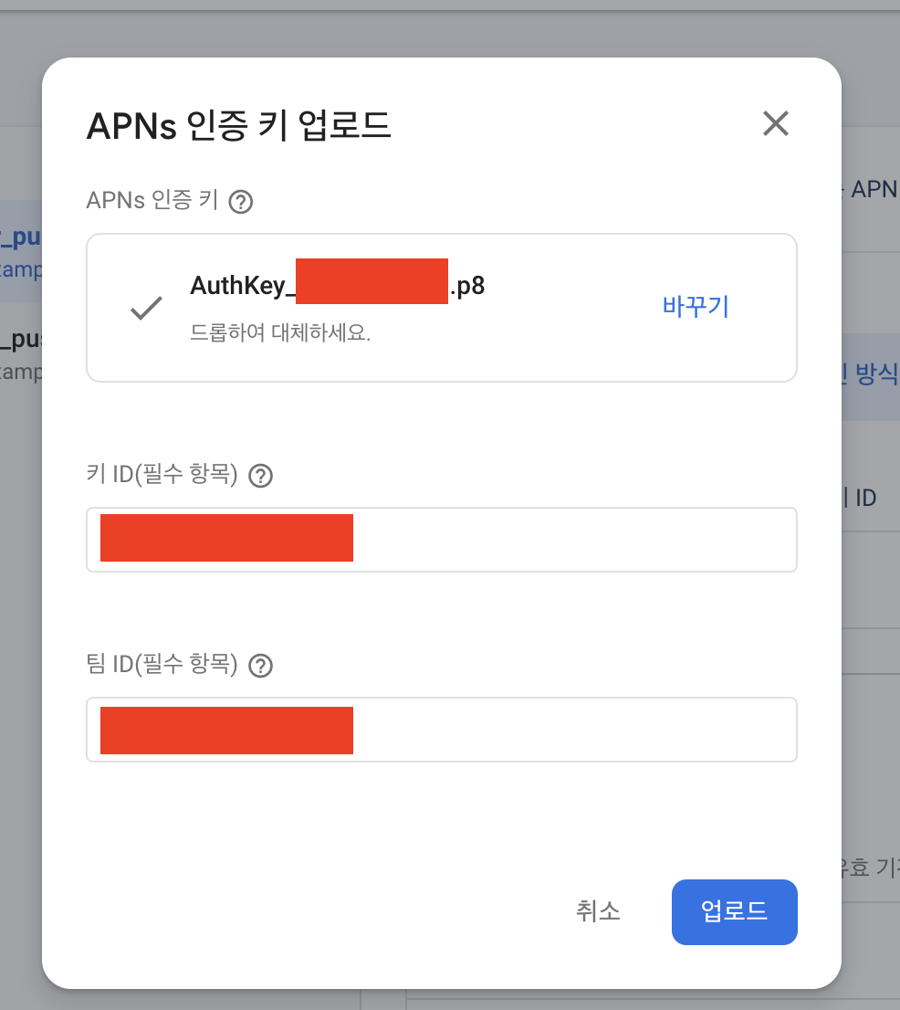 [프로젝트 개요 옆 톱니바퀴] > [클라우드 메시징 탭] > [Apple 앱 구성] 항목 > [APN 인증 키 업로드]