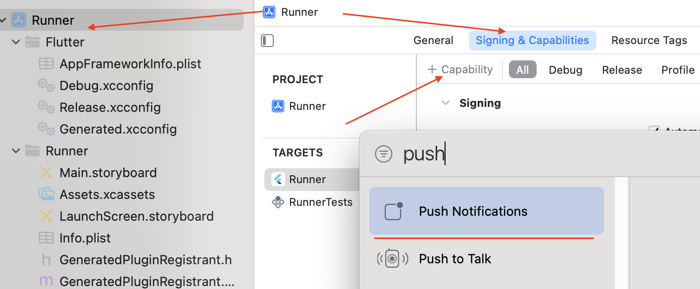 5. Runner > Targets [Runner] > Signing & Capabilities > + Capability 클릭 > Push Notification 을 검색 후 추가합니다.