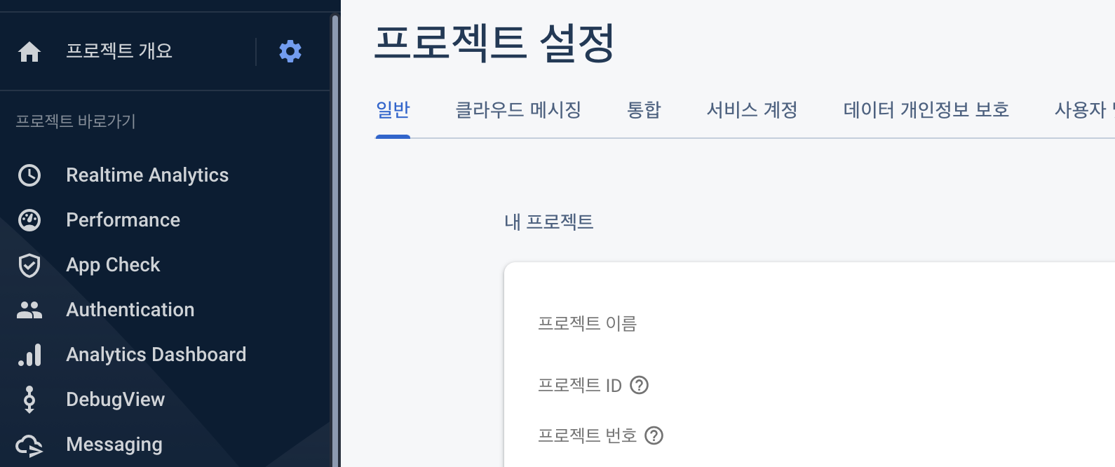 - 생성 후, 프로젝트 개요 톱니바퀴 > 일반 탭 > [프로젝트 ID] 를 기억 해 둡니다